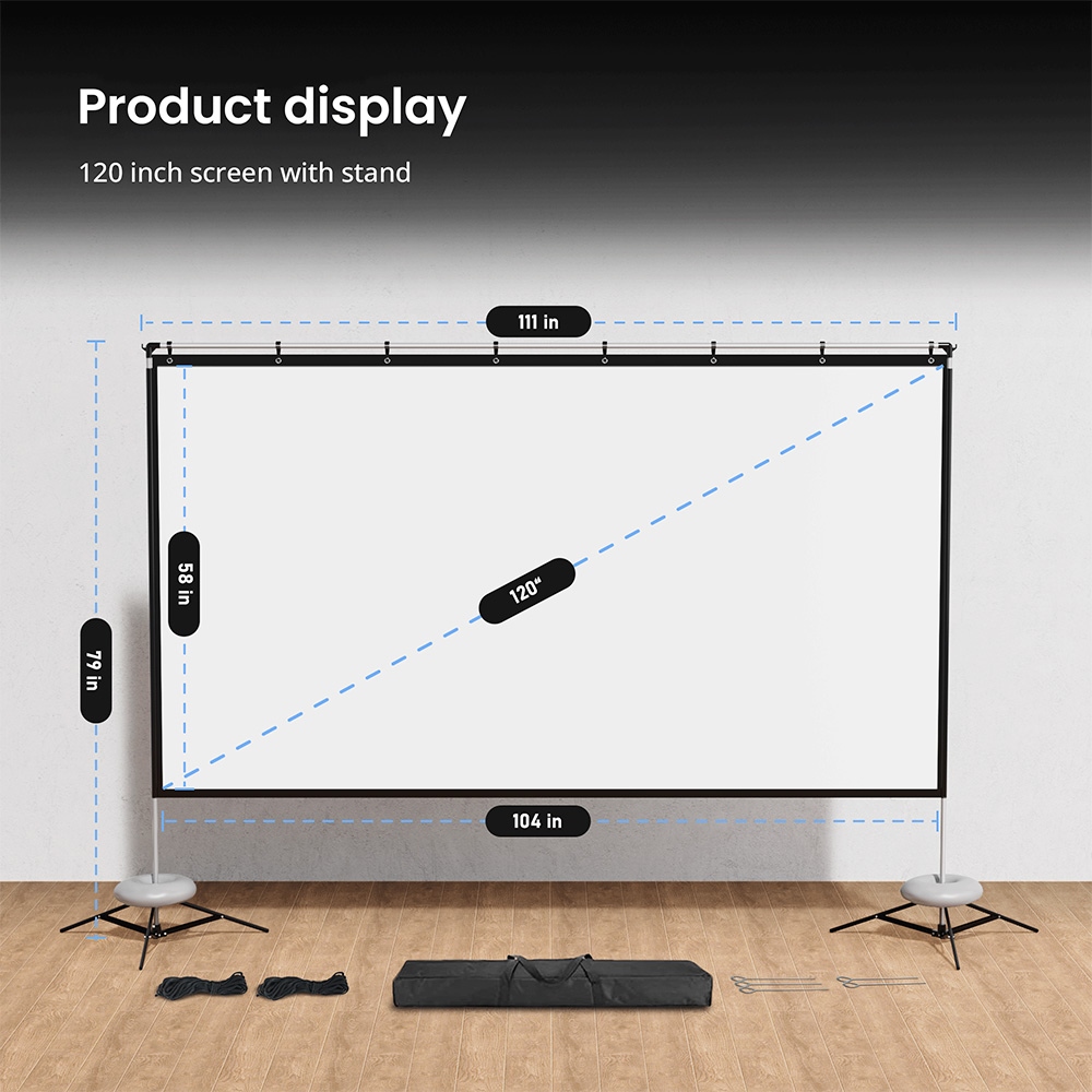 Écran de projection et support de 120 pouces, rapport 16:9, grand angle de vision de 165°, l'écran de projection est conçu pour fournir des images nettes et haute résolution, des couleurs enrichies et une expérience de visionnage suprême à partir de différentes positions de visualisation.