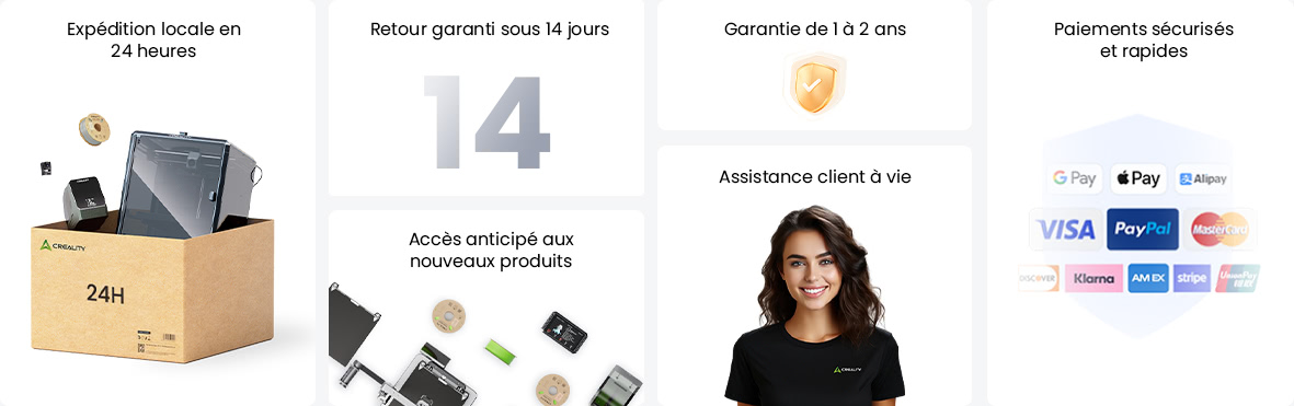 | Capteurs de fin de filament et d’emmêlement (intégrés au CFS lorsqu’il est utilisé). | Caméra d’assistance au nivellement du lit (analyse automatique de la première couche pour détecter une inclinaison ou une mauvaise adhérence). | • Surveille les impressions et envoie des alertes en cas d’échec de type spaghetti ou de collisions avec des objets étrangers (lorsqu’elle est connectée à Creality Print/Cloud). | • Les capteurs LiDAR cartographient la première couche pour une adhérence optimale au plateau et un calibrage du débit. | |